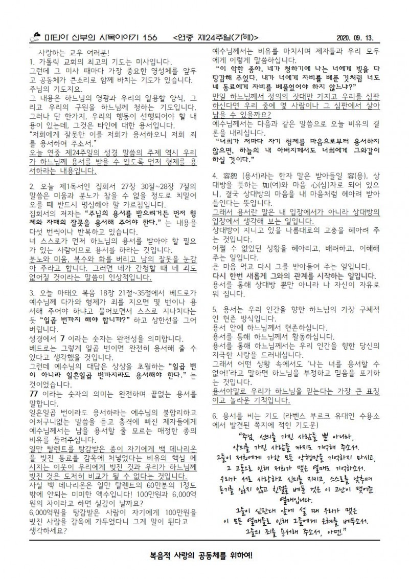 9월 13일(마티아 신부의 사목이야기 156) 최고관리자 2020.09.12 12:46 3,255 0 LV.20 21% - 첨부파일 : 20200913-7면주보용001.jpg (313.1K) - 다운로드 0 2020-09-12 12:46:44 - 첨부파일 : 20200913-7면_마티아 신부의 사목이야기156_.pdf (228.0K) - 다운로드 5 2020-09-12 12:46:44 - 짧은주소 : http://yscatholic.com/bbs/?t=1l4 주소복사 × 짧은 글주소 복사 복사하기 Note! '복사하기' 버튼을 클릭하면 내 컴퓨터 클립보드에 복사됩니다. 이전글 다음글 목록 본문 9월 13일(마티아 신부의 사목이야기 156) 입니다. 댓글목록 0 등록된 댓글이 없습니다.