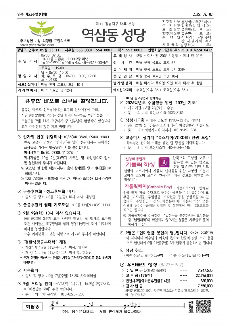 9월 7일(연중 제23주일) 본당 소식